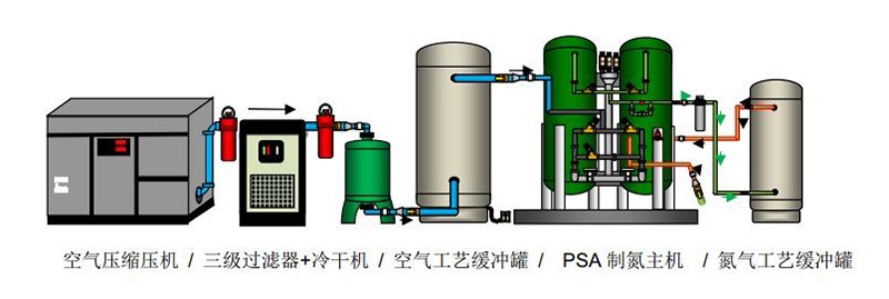 根據(jù)“2.1 PSA變壓吸附制氮工藝流程示意圖”,空氣壓縮機(jī)輸出的壓縮空氣經(jīng)內(nèi)部的進(jìn)氣閥進(jìn)入氣水分離器除掉99%的液態(tài)水,得到高溫壓縮空氣后,進(jìn)入一級(jí)管道過(guò)濾器濾除>3μm的微粒及部分水分,再進(jìn)入冷凍干燥機(jī)強(qiáng)制冷卻降溫,常溫壓縮空氣中的水蒸汽凝結(jié)成液態(tài)水,由自動(dòng)排污閥排出,得到壓力露點(diǎn)<2~5℃的干燥壓縮空氣,然后經(jīng)第二級(jí)管道式超精過(guò)濾器濾除水、油,最后經(jīng)第三級(jí)活性碳(罐式)除油過(guò)濾器深度吸附除氣態(tài)油,最終得到雜質(zhì)<0.01um、含油<0.003ppm、壓力露點(diǎn)溫度<2~5℃潔凈的壓縮空氣。為了延長(zhǎng)制氮分子篩的使用壽命,須將空氣中的有害物質(zhì):油、水、灰塵等通過(guò)冷干機(jī)/吸干機(jī)以及過(guò)濾器除去。從而保證制氮碳分子篩使用壽命更長(zhǎng),長(zhǎng)期操作成本低。