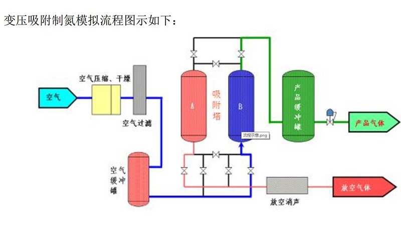 本套制氮裝置采用變壓吸附(PSA)工藝,其基本原理是利用吸附劑對(duì)吸附質(zhì)在不同壓力下有不同的吸附容量,并且在一定壓力下對(duì)被分離的氣體混合物各組分又有選擇吸附的特性。在吸附劑選擇吸附的條件下,加壓吸附除去原料氣中的雜質(zhì)組分,減壓脫出這些